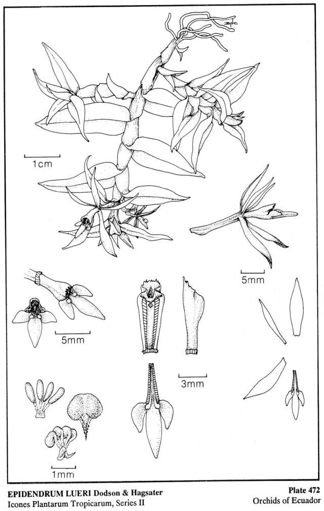 "Epidendrum lueri Hágsater & Dodson is part of GROUP Nanum and is recognized by the pendent stems, the stems branching, the short, terminal inflorescence carrying simultaneous flowers. Epidendrum madsenii Hágsater & Dodson is similar with the pendent stems Epidendrum whittenii has small, caespitose, recumbent plants, the leaves fleshy, all in one plane, with 3 apical, conduplicate, imbricating, prominent bracts, the flowers appear singly in succession and are rather large for the plant, white, with an orbicular lip, base cordate, with prominent, irregular keels. Epidendrum cuchibambae Lehm. & Kraenzl. also has large imbricating bracts at the base of the inflorescence, but the plant habit is different, with erect stems and leaves grass-like." Hagsater etal 1993