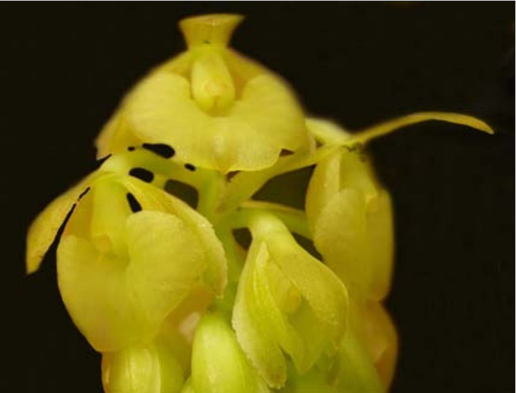 Found in Valle de Cauca department of Colombia on the western slope of the central Codillera in secondary, humid, cloud forests at elevations around 3500 meters as a small sized, cold growing epiphyte with terete, new stem arising from subapical internode of the previous stem carrying 3, towards the apex, unequal in size, subcoriaceous, alternate, articulate, obovate-elliptic, obtuse, margin entire leaves that blooms in the late winter and early spring on a terminal, without a spathe, occuring only once, peduncle .64” [1.6 cm] long, terete, thin, straight, 2.16” [5.4 cm] long overall, successively few, 10 to 15 flowered inflorescence with half as long as the ovary, triangular, acuminate, amplexicaul floral bracts and carrying yellow, non fragrant flowers.