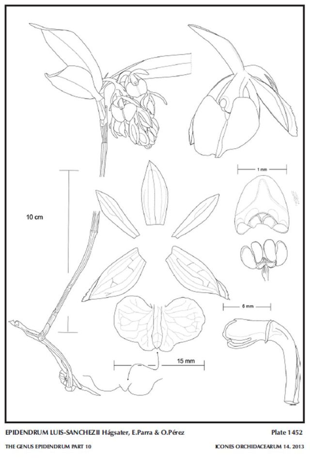"Epidendrum luis-sanchezii belongs to the GROUP Arbuscula which is characterized by the erect habit with successive lateral growths produced from the middle of the previous growth, few leaves aggregate towards the apex of the stems, roots generally only from the base of the primordial stem, and the SUBGROUP Incomptum which has a short apical inflorescence with fleshy yellowish to green to violet-green to black flowers with short ovaries, the lip entire to 3- lobed. The species is recognized by obovate-elliptic leaves, the yellow flowers, sepals with a prominent, acute and a serrulate keel on the ventral side, the apical 1/4 of the petals hidden beneath the ecallose lip which is obscurely 3-lobed, the mid-lobe emarginate, apiculate, forming a pair of rounded lobes, with a low thick rib running the length of the lip. Epidendrum aylacotoglossum Hágsater has elliptic leaves, the clearly 3-lobed lip with a pair of low calli and a short canal in the middle, and the column sigmoid. Epidendrum envigadoënse Hágsater has narrow, lanceolate leaves, a wider lip .682" to .76" [17.5 to 19 mm] with a pair of small calli and the apex emarginate, not apiculate. Epidendrum amayense Hágsater has linear-lanceolate leaves .2 to .24" [.5-.6 mm] wide, somewhat smaller, green flowers, the sepals .36" [9 mm] long with a low dorsal keel, and the lip without any thickened rib. Epidendum oligophyllum F.C. Lehm. & Kränzl. is vegetatively very similar, with oblong-elliptic to elliptic leaves, olive-brown flowers, the lip bicallose and the column .4" [10 mm] long. Epidendrum morae P.Ortiz, Hágsater & L.E.Álvarez has elliptic leaves, pale yellow flowers somewhat tinged pink-violaceous, the sepals have no dorsal keel, and the 3-lobed lip is bicallose with 3 low ribs on the disc." Hagsater etal 2013