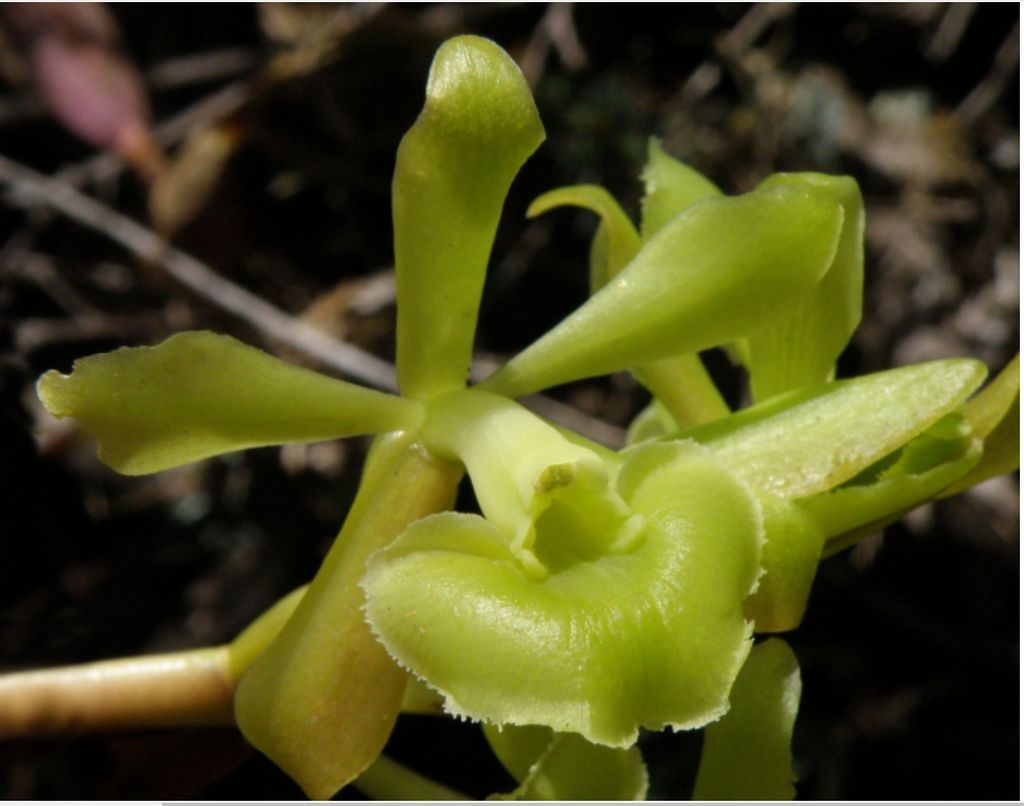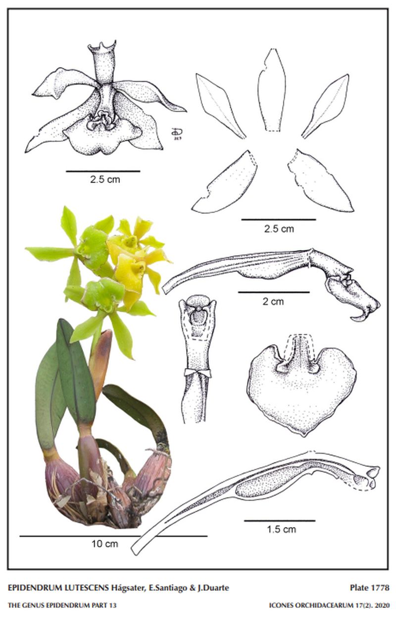"Epidendrum lutescens belongs to the GROUP Saxicola characterized by the pseudobulbous stems, caespitose or scandent habit, the prominent spathe apically rounded, few-flowered, erect inflorescence, flowers purple or yellow, and surface of the vegetative structures often rugose. The species is recognized by the large, apple green flowers that turn yellow as they age, sepals 1 to 1.04" [25 to 26 mm] long, convex, petals .96 x .28" [24 x 7 mm], rhombic-spatulate, acute, lip .68 x .64" [17 x 16 mm] , obscurely pentagonal, with laminar calli widely separated. Epidendrum milpoënse Hágsater & E.Santiago has 2 to 3 green flowers but much smaller, sepals .72 to .76" [18 to 19 mm] long, petals .64 to .69" x .2 to .28" [16 to 17.5 x 5.0 to 7.0 mm], lip .44 x .6" [11 x 15 mm], widely cordiform, obtuse, and calli small and globose. Epidendrum microcattleyioides D.E.Benn. & Christenson has 4 yellow flowers with the margins white, sepals .48 to .52" [12 to 13 mm] long, petals, .42 x .26" [10.5 x 6.5 mm], obovate, apex obtuse-rounded, lip reniform with globose calli. Epidendrum saxicola Kraenzl. has 2 flowers with sepals .6 to .72" [15 to 18 mm] long, dirty pale purple brown to pink, petals and lip white tinged purple to pale green, petals .6 to .72" x .2 to .24" [15 to 18 x 5 to 6 mm], linear-oblanceolate, lip sub-orbicular to widely cordiform. Epidendrum magnisaxicola Hágsater, Edquén & E.Santiago has 2 greenish yellow flowers, sepals tinged brown, sepals 24-25 mm long, petals 1 x .16" [25 x 4 mm], oblanceolate, lip .54" x .44" [13.5 x 11 mm], ovate-rhombic, base truncate. *NOTES: The original description of Epidendrum microcattleyioides indicates that the dorsal sepal measures .6 x .26" [15 x 6.5 mm], and lateral sepals .9 x .3" [22.5 x 7.5 mm]. Analyzing a flower in spirit of the type, Bennett 7939 at MOL shows that the flowers are smaller, sepals are .48 to .52" x .24 to .28" [12 to 13 x 6 to 7 mm]. The specimens collected by Vásquez and Krömer from Bolivia were not seen but indicated by Vásquez (2004) (the private herbarium of Roberto Vásquez was transferred to LPB)." Hagsater etal 2020