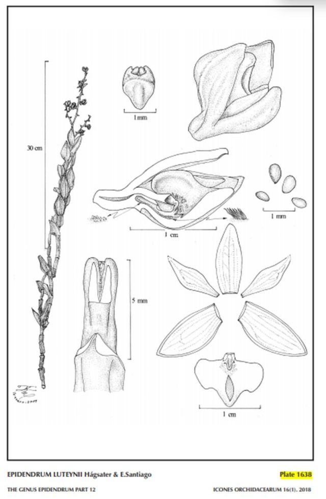 "Epidendrum luteynii belongs to the GROUP Aquaticum which is characterized by the monopodial, branching habit, the distichous, erect to arching-nutant inflorescence carrying fleshy flowers with the disc of the lip and/or nectary often pillose. The new species is recognized by the ovate, acute leaves generally sub-parallel to the stem and imbricated, erect inflorescence, paniculate to racemose, flowers greenish orange, laxly distributed on the rachis with floral bracts .12 to .24" x .16 to .2" [3 to 6 x 4 to 5 mm], petals narrowly rhombic, and the lip clearly 3- lobed with the base truncate. Epidendrum commelinispathum is vegetatively very similar, but the inflorescence is much shorter and fewer flowered, the flowers greenish yellow, tinged brown, densely aggregate on the rachis, floral bracts .2 to .28" x .24 to .32" [5 to 7 x 6 to 8 mm], petals linear-oblong, and the lip shallowly 3-lobed, the base broadly cuneate. Epidendrum ulei Schltr. has oblong leaves, sub-spreading, inflorescence straight with greenish yellow to ochre flowers, petals linear-oblanceolate." Hagsater etal 2018
