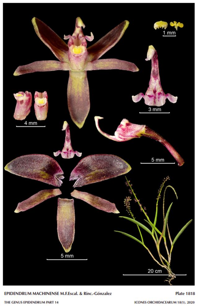 "Epidendrum machinense belongs to the GROUP Mancum SUBGROUP Stenoglossum which is characterized by the sympodial habit, stems of one or few leaves, a racemose, ancipitose, elongate, arching inflorescence with 1 to 2 spathes with parallel sides; and the flowers lip always directed towards the apex of the rachis, a short column, an entire or 3-lobed lip, tiny hamate lateral lobes and a filiform linear midlobe with a rhomboid sagittal apex. The species is recognized by the tall plants, 12.8 to 14.8" [32 to 37 cm] tall including the inflorescence, the inflorescence .88 to 1.12" [22 to 28 cm] long with 50 to 80 simultaneous flowers with yellow corolla suffused purple-brown with yellow apices and a white lip and a column with numerous wine-red spots, a dorsal sepal shorter than the lateral sepals, the petals flanking the column, 3-veined, and the 3-lobed lip, lateral lobes broadly hamate in position, mid-lobe triangular-linear, apex inflexed, rhombic or bifid apex, and bicallose. Epidendrum coryophorum (Kunth) Rchb.f. is distinguished by the smaller plants, 6 to 12" [15 to 30 cm] tall including the inflorescence, 3.2 to 9.2" [8 to 23 cm] long, with 10 to 34 simultaneous flowers, the purple flowers often with white apices, the petals narrow, flanking the column, 1- veined, and by the linear lip without calli. Epidendrum hamatum (Garay) Dressler is vegetatively very similar but the flowers are white slightly tinged pink, with pink-red dots at the apex of the column and base of the lip and is apparently endemic to Cundinamarca and Boyacá, north of Bogotá. Domínguez and Hágsater published a plate under the name E. hamatum (2019) of a similar species well known from around Medellín, Antioquia, with yellow-green flowers mottled with brown dots, but that is a new species which is being described elsewhere." Hagsater etal 2020