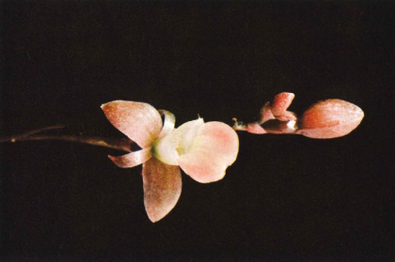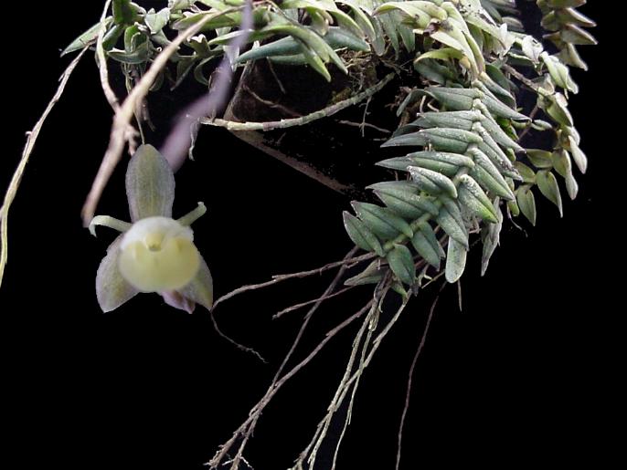 Found in Mexico, Guatemala, Belize, Nicaragua, Costa Rica and Panama on the Atlantic slope, on lower trunks of large trees in humid forests at elevations of sealevel to 1000 meters as a miniature sized, hot to warm growing epiphyte with cylindric, compressed stems enveloped by leaf sheaths with fleshy, ovate to lanceolate, falcate, abaxially carinate, gray-green above, obtuse to acute, conduplicate below and subcordate at the base leaves that blooms at most anytime of the year on a terminal, erect, 2 to 3.2" [5 to 8 cm] long, single successively flowered, somewhat fractiflex inflorescence lasting several seasons with flowers that are weakly fragrant at sunup.