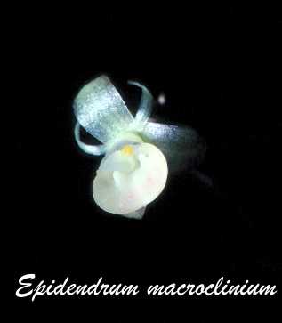 " Epidendrum macroclinium belongs to the GROUP Physinga which is characterized by the generally small, caespitose plants, the inflorescence apical and racemose producing new racemes with time and thus pluriracemose, the successive flowers opening one at a time on an elongate peduncle with acuminate bracts, the lip entire and the ovary with a prominent vesicle. The species is recognized by the .6 to 1.8" [1.5 to 4.5 cm] long, spreading, ovate-lanceolate, gray-green leaves, sometimes with the foliar veins thickened and very evident on the basal half of the upper side of the leaves, the reflexed petals, obreniform lip with the narrow calli separated from the apex of the column and each other, and the very prominent, fimbriate-dentate clinandrium-hood. Epidendrum prostratum (Lindl.) Cogn. is vegetatively very similar, but the sepals and petals are partly spreading, the base of the lip deeply cordate, with 3 prominent keels on the disc, and the clinandrium-hood deeply emarginate, the margin entire. Epidendrum physodes Rchb.f. has the leaves inserted at a 45° angle to the stem, lanceolate, short-acuminate, gray-green leaves 1.4 to 2.8" [3.5 to 7 cm] long, spreading petals, the lip transversely elliptic with a pair of prominent, rounded calli in front of the column, and the clinandrium-hood short, fleshy, the margin slightly crenate." Hagsater etal 2010