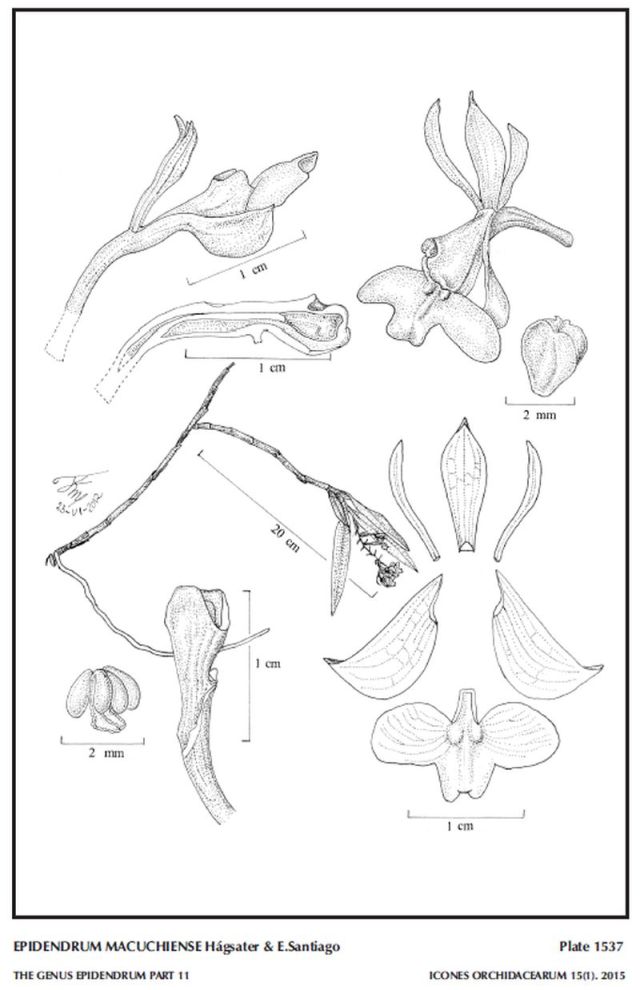 "Epidendrum macuchiense belongs to GROUP Arbuscula SUBGROUP Incomptum which is characterized by the successive lateral growths produced from the middle of the previous growth, few leaves aggregate towards the apex of the stems, a short apical inflorescence with fleshy greenish to violet-green flowers with short ovaries, the lip entire to 3-lobed. The species is recognized by the green flowers, the deeply 3-lobed lip, twice as wide as it is long, .346 x .66" [8.6 x 16.1 mm], the lateral lobes semi-orbicular, and the quadrate-cuneate, emarginate mid-lobe, and the thin, linear-oblanceolate petals .43 x .04" [10.8 x 1 mm]. It resembles Epidendrum homoion Hágsater & Dodson, has a very similar shaped lip .56 to .64" x 1.04 to 1.12" [14 to 16 x 26 to 28 mm], but has obtrullate petals which are much wider .34 x ,24 to .26" [8.5 x 6.0 to 6.5 mm]; the sepals and petals are green and the lip olive-green to purplish green. Epidendrum boekei Hágsater also has a 3-lobed lip, but it is nearly as long as it is wide, .44 to .56 x .56 to .72" [11 to 14 x 14 to 18 mm], the lateral lobes are slightly retrorse, petals narrowly oblanceolate, apex rounded .46 x .12 to .24" [11.5 x 3 to 6 mm], and the calli are narrower and divergent. Epidendrum oenochromum Hágsater & Dodson has burgundy-red colored flowers, the lip is proportionately wider than long, .4 x .56" [10 x 16 mm], but the lateral lobes are orbicular, and petals oblong, .468 x .088" [11.7 x 2.2 mm]." Hagsater etal 2015