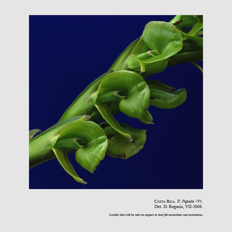 Found in Costa Rica and Panama in wet forests and rarely on roadbanks at elevations of 1250 to 2400 meters as a small to medium sized, cool to cold growing epiphyte or terrestrial with simple, cane-like, erect, laterally compressed, straight stems and carrying 2 to 4, all along the apical half of the stem, distichous, subcoriaceous, narrowly oblong to elliptic, deeply bilobed, margin entire, articulate below into the base leaves that blooms in the late winter through late summer on a terminal, simple, racemose, occuring only once, distichous, erect, zig-zag, laterally compressed, ancipitose, 1.4" to 2.4" [3.5 to 6 cm] long, few to several flowered inflorescence arising on a mature growth, with 3 to 9, imbricating, conduplicate, carinate, longly acuminate, minutely denticulate bracts and with longer than the ovary, ovate, longly acuminate, conduplicate, imbricating floral bracts and carrying 4 to 10, simultaneously opening, non-resupinate, secund, nocturnally, weakly fragrant flowers.