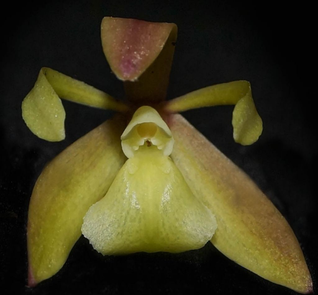 Found in northern to central Peru, on the eastern slope of the Andes in the Departments of Cajamarca, Amazonas bordering on San Martin and Pasco, at elevations of 2561 to 3074 meters as a miniature sized, cold growing epiphyte with thickened, forming fusiform pseudobulbs, striated and rugose; covered by a single, membranaceous, brown, translucent, becoming fibrous sheath carrying a single, apical, articulate, coriaceous, narrowly elliptic, apex obtuse, margin entire, spreading, copper-brown when young during flowering, turning green when mature leaf that blooms in the winter, spring and summer on a terminal, erect, arising through a single, tubular, oblong, conduplicate, apex rounded, copper-brown spathe, peduncle 1.6 to .171" [4.0 to 4.8 cm] long, terete, thin, straight, erect, creamy brown, about as long as the spathe and nearly totally hidden within it 2.72" [6.8 cm] long overall, including the flowers, apical from the developing stem, when the leaf has reached its full length, sub-erect, racemose, simultaneously 2 flowered inflorescence with much shorter than the ovary, triangular-ovate, acute, embracing, cream colored floral bracts and carrying resupinate, pale greenish yellow flowers with the sepals tinged brown, anther white; fragrance not registered