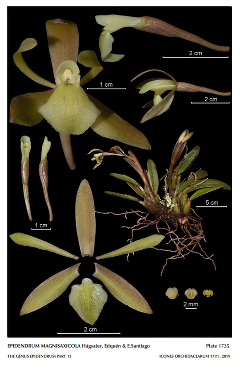 "Epidendrum magnisaxicola belongs to the GROUP Saxicola characterized by the pseudobulbous stems, caespitose or scandent habit, the surface of the vegetative structures often rugose, the prominent spathaceous bract apically rounded, few-flowered, erect inflorescence, the flowers purple or yellow. The new species is recognized by the large flowers, sepals .96 to 1" [24 to 25 mm] long, pale greenish yellow, the sepals tinged brown, oblanceolate petals 1 x .16" [25 x 4 mm], lip .56 x .44" [13.5 x 11 mm], entire, ovate-rhombic, base truncate, revolute in natural position. It is similar to Epidendrum saxicola which has purple flowers with a white lip, tinged purple, sepals .6" [15 mm] long, petals .52 x .1" [13 x 2.5 mm], lip sub-orbicular to obscurely pentagonal. Epidendrum harmsianum Kraenzl. has sulfur-yellow, smaller flowers, sepals .64" [16 mm] long, lip transversely ovate-oblong, base sub-cordate. Epidendrum macrogastrium Kraenzl. also has smaller, yellow flowers sepals .48" [12 mm] long, petals .4 x .04 to .048" [10 x 1.0 to 1.2 mm], linear, and lip widely cordiform." Hagsater etal 2019