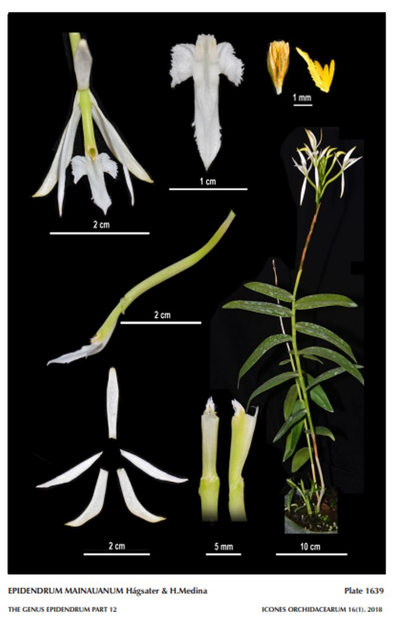 "Epidendrum mainauanum belongs to the GROUP Amphyglottis SUBGROUP Glossaspis which is recognized by the caespitose habit, simple stems, leaves oblong-lanceolate, coriaceous, bilobed and elongate peduncle of the erect, racemose inflorescence, the flowers nonresupinate, the callus simple, elongate, fleshy, sulcate towards the base. The new species is recognized by the pure white flowers, with the large callus white, flowers large with sepals .ñ88" [22 mm] long, straight, petals 3-veined, .64" [1.6 mm] wide, lip has short sub-quadrate lateral lobes that are only about ¼ the length of the entire lip, sub-quadrate to sub-rhomboid, apex acute. It very much resembles Epidendrum glossaspis, which, however, has rose-purple flowers, with a white callus, spreading, 1.04 to .35" [26 to 33 mm] long sepals, straight petals, linear-triangular .04" [1 mm] wide at the base, and the lip formed by 3, sub-parallel lobes, the lateral lobes about half as long as the entire lip, sub-rhombic, acuminate. Epidendrum glossapis has been confused with E. blepharoclinium Rchb.f. is quite similar in color, but the lip is wider in all its parts, the mid-lobe rhombic, about as wide as it is long, the petals as wide as the sepals which are .84 to 1.04" [21 to 26 mm] long; the callus is massive, formed by a lanceolate thickened mass, with a pair of digitate, short, upturned calli at the base, continued by two thickened, elongate processes terminating in a bilobed apex, and underneath these a thickened “Y” shaped rib, the base wide, somewhat sulcate, and ending in a progressively thinner mid-rib that reaches the apex of the mid-lobe of the lip. Epidendrum hookerianum Rchb.f. is similar but the sepals and petals are very narrow, the lateral lobes are semi-ovate, deeply fimbriate towards the apex of the outer margin, and the mid-lobe is linear-lanceolate, the margin sub-dentate and has a mid-rib running down the middle." Hagsater etal 2018