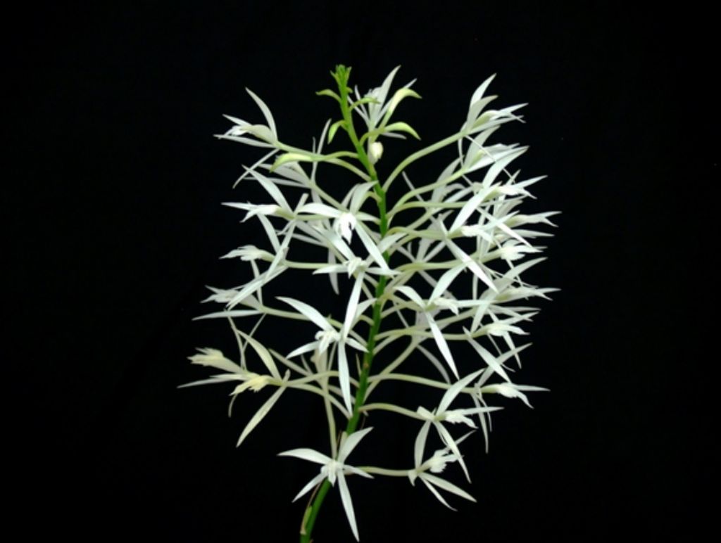 Found in Morona-Santiago province of Ecuador on eastern slope of the Cordillera Oriental of the Andes at elevations around 2000 meters as a small to large sized, cool to cold growing terrestrial or epiphyte with simple, cane-like, terete, erect, straight, green stems carrying 9+, distichous, distributed throughout the stem, alternate, articulate, green, unequal in size, the basal and apical leaves somewhat shorter, with tubular, minutely striated leaf sheaths, narrowly elliptic-lanceolate to lanceolate oblong, apex sub-obtuse, coriaceous, dark green leaves that blooms in the spring on an erect, terminal, without a spathe, peduncle 6" [15 cm] long, elongate, terete, covered by 5 , tubular, acute, not imbricated, brown bracts, 9 to 20" [22.5 to 50 cm] long, apical, racemose, successively 4 to 25, many-flowered inflorescence with much shorter than the ovary, linear-triangular, acuminate, embracing floral bracts and carrying non-resupinate, white flowers with a white callus, pale yellow ovary and without fragrance.