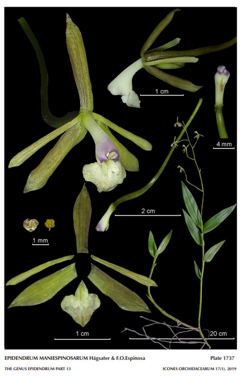 "Epidendrum maniespinosarum does not match any group well, and thus I propose a new group for this species, the GROUP Maniespinosarum which has caespitose habit, erect paniculate inflorescence, without spathe, few, laxly spaced resupinate flowers, a simple triangular, bicallose lip. It is somewhat reminiscent of the GROUP Herrenhusanum , recognized by the caespitose, sympodial habit, the erect racemose inflorescence subtended by a narrow, long spathe, and non-resupinate flowers. The new species is recognized by the unequal, progressively larger leaves 1.6 to 4" x .52 to .8" [4.0 to 10 x 1.3 to 2.0 cm], lack of any visible spathes, resupinate flowers green, column white, sometimes tinged purple towards the apex, lip white; sepals .508 to .556" [12.7 to 13.9 mm] long, the lip entire, triangular, with the side angles rounded, the apex sub-acute. Epidendrum clavadista Hágsater & Collantes has linear-lanceolate leaves .12 to .2" [0.3 to 0.5 cm] wide, small, nonresupinate flowers, sepals .36 to .4" [9 to 10 mm] long, ochre-yellow, the base of the petals white, apex ochre-yellow, the column and lip white, the apex of the column marked in purple, lip shallowly 3-lobed, mid-lobe of the lip triangular. Epidendrum herrenhusanum Hágsater from between Bucaramanga and Pamplona, Colombia, has larger flowers, sepals .8" [20 mm] long, flowers entirely bronzy-yellow, except for the green column, and mid-lobe of the ovate-acuminate lip; petals are linear. Epidendrum yambrasbambense Hágsater, from Amazonas, Peru, also has very narrow leaves, .12 to .2" [0.3 to 0.5 cm], but greenish white flowers, similar in size, sepals .36 to .4" [9 to 10 mm] long, the lip equally 3-lobed, but the mid-lobe square, apex slightly emarginate; petals free, spreading. Epidendrum veroreveloi Hágsater & Dodson from Ecuador has wider leaves, .64" [1.6 cm] wide, larger copper-green flowers, apical half of the column apple-green, sepals .6 to .64" [15 to 16 mm[ long, and lip entire, ovate, base cuneate, apex obtuse, petals free, spreading." Hagsater etal 2019