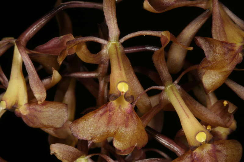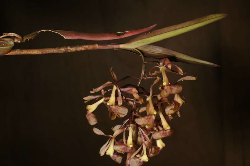 Found in southern Peru on the upper ridge of the Amazon slope at elevations of 2500 to 4600 meters as a medium sized, cold growing epiphyte with a simple, cane-like, terete, thin, straight stem that produces a new stem from the subapical node of the previous stem and carrying 3, aggregated towards the apex, narrowly elliptic, acute, smooth, spreading leaves that blooms at most any time of the year on a terminal, occuring only once, racemose, arching-nutant, laterally compressed, laxly few [8 to 12] flowered inflorescence with floral bracts that are nearly as long as the ovary, linear to triangular, acuminate, basally conduplicate floral bracts and carrying simultaneoulsy opening, resupinate, fleshy flowers.