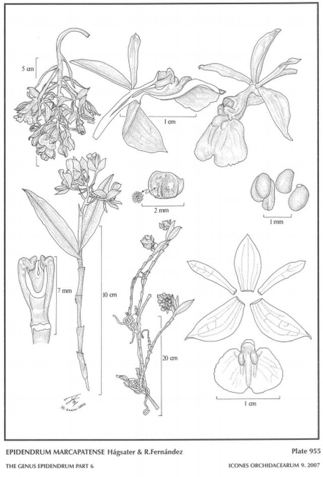 "Epidendrum marcapatense belongs to the GROUP Arbuscula SUBGROUP Incomptum, characterized by the sympodial habit, the new growth produced from the mid-nodes of the previous cane-like growth below the leaves, the apical inflorescence flowering one time only, and the roots produced at the base of each new growth, not at the intermediate nodes, the flowers fleshy. The species is recognized by the.36 to .4" [9 to 10 mm] long sepals, the lip is bilobed, reniform, base cordate, apex emarginate, margin erose. Epidendrum nephroglossum Schltr. has comparatively wide, acuminate floral bracts, a .52" [13 mm] wide lip, the sepals being .44" [11 mm] long, and the petais linear-oblanceolate and somewhat acuminate, it was described from the Chanchamayo valley in Junín province of Peru. It is similar to E. latisegmentum C. Schweinf. which has larger flowers, sepals .72 to .84" [18 to 21 mm] long, a thin uninflated nectary, a íarge, bilobed, reniform lip, and the relatlvely wide sepals and petals. Epidendrum marsiorum R. Vásquez & Ibisch, has an entire lip about .36" [8 mm] wide, sepals .36 to .4" [9 to 10 mm] long, and leaves 2 to 4.8" x .4 to .8" [5 to 12 x 1 to 2 cm], and is found in eastern Peru and neighboring Bolivia. It is somewhat similar to Epidendrum fujimorianum D. E. Benn. & Christenson which has a 4 lobed lip, the apical lobes small and semicircular." Hagsater etal 2007