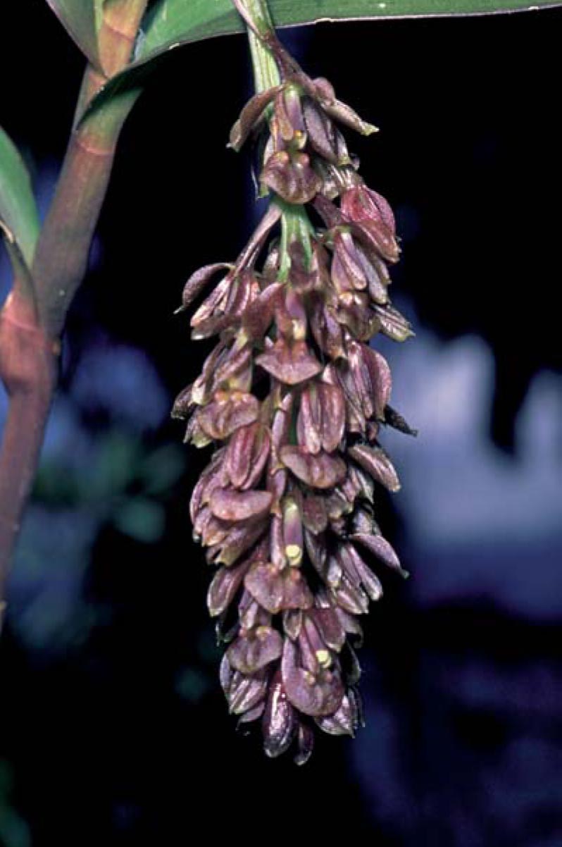 Found in Cochabamba department of Bolivia in wet, montane forests in mosses at elevations around 2650 meters as a medium sized, cold growing epiphyte with erect, cylindrical, new growth arising from just below to just above the internodes at the middle of the previous stem carrying 3 to 5 deciduous, distributed along the apex, linear-elliptic, attenuate leaves that blooms on a terminal, racemose, nutant, peduncle 2" [5 cm] long, somewhat compressed, provided with 2 narrowly triangular bracts 4.8" [12 cm] long, many flowered inflorescence with slightly longer than the ovary, narrowly triangular floral bracts and carrying fleshy, chocolate colored flowers.