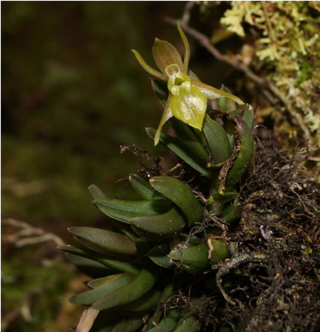 Found in northern Peru within the departments of San Martín and Amazonas in wet montane forests with abundant moss, and accumulation of organic matter at elevations around 1800 meters as a mini-miniature sized, cool growing epiphyte with cane-like, simple, laterally compressed, somewhat reclining stems carrying 4, fleshy, distichous, erect, concave, arching and partially imbricated, somewhat conduplicate, dark green, concolor; leaf sheath tubular, narrow at the base gradually widened towards the apex; blade narrowly lanceolate obtuse to sub-acute, minutely apiculate, margin entire, dentate at the apex leaves that blooms in the summer on a terminal, arising through a .36 x .28" [9 x 7 mm] when spread, elliptic, obtuse, minutely apiculate, conduplicate spathe, sessile, single-flowered inflorescence with hidden within the spathe floral bract and carrying a resupinate yellowish green flower with the lip concolor, sepals and petals somewhat tinged bronze; fragrance not registered.