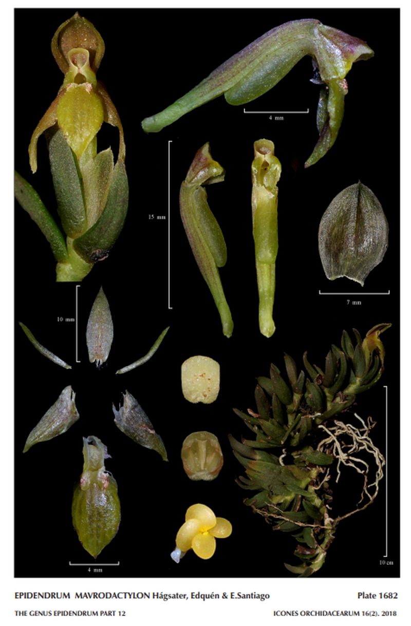 "Epidendrum mavrodactylon belongs to the GROUP Porpax, which is characterized by the sympodial, somewhat repent habit, usually forming large mats; short, cane-like stems with very fleshy, succulent, articulate, distichous leaves, the apical margin minutely ciliate; single-flowered inflorescence, sessile flowers; and the lip generally reddish purple. The new species is recognized by the very small plants, to 1.2" [3 cm] tall, with leaves .2 to .52" [0.5 to 1.4 cm] long, semi-terete, concave and arching, flowers yellowish green, sepals and petals tinged bronze; dorsal sepal and petals nearly parallel to the column, lip elliptic, acute, immaculate and the ovary with a prominent ventral, elongate vesicle, half as long as the ovary. Epidendrum althaniorum from Cusco has larger plants,1.8 to 4" [4.5 to 10 cm] tall, leaves .52 to 2" [1.3 to 5 cm] long, straight, flowers lime-yellow, lip orbicular, rounded with a heart-shaped red blotch in the middle, and the ovary not inflated, not forming a vesicle. There is a photograph of a species from Bolivia in Vásquez (2004) which somewhat resembles this species, but no data of the origin of that photograph is given, and the cited specimens evidently include several species none of which correspond to Epidendrum peperomia Rchb.f. "Hagsater etal 2018