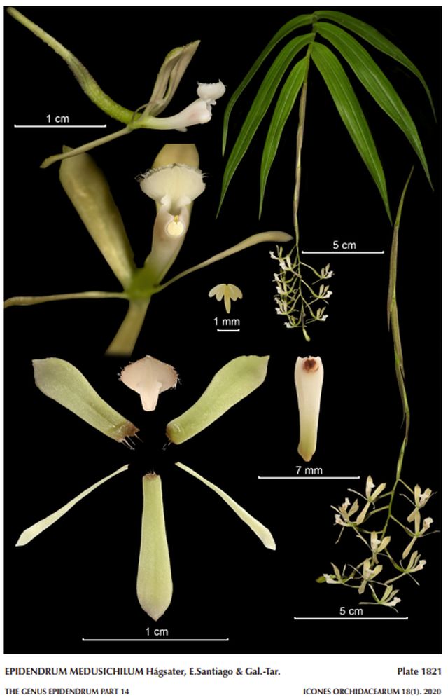 "Epidendrum medusichilum belongs to the GROUP Jatunsachanum, which is recognized by the caespitose habit, numerous narrow leaves, the apical inflorescence in young stems, the lateral inflorescences in mature plants of some species, the inflorescences producing new racemes through time, the lip with margins fimbriate, and the pollinia obovoid, not “bird-wing” type. The species is recognized by the arching stems with sub-plicate, lanceolate, long-acuminate leaves, the inflorescence with a long peduncle, the laxly 11 flowered raceme, flowers spreading horizontally and lip facing downwards, pale buff colored, column and lip white, the lip transversely elliptic, fleshy, convex, the margins revolute, fimbriate, hyaline, sepals .36 to .4" [9.0 to 10 mm] long, dorsally pustulate towards the apex, and the ovary pubescent. Epidendrum jatunsachanum Dodson & Hágsater is vegetatively similar, but produces solitary, successive flowers, sepals .64 [16 mm] long, yellowish brown inside, dorsally green, lip white heavily dotted with purple, the 3-lobed lip has lateral lobes obliquely rectangular, and the mid-lobe is flabellate, ovary unornamented. Epidendrum hajekii Vásquez & Dodson has linear-lanceolate leaves, 3 flowers, sepals .46 to .64" [11.5 to 16 mm] long, greenish brown and the lip white tinged purple, lip 3-lobed, the lateral lobes sub-quadrate, and the ovary unornamented." Hagsater & Cisneros 2020