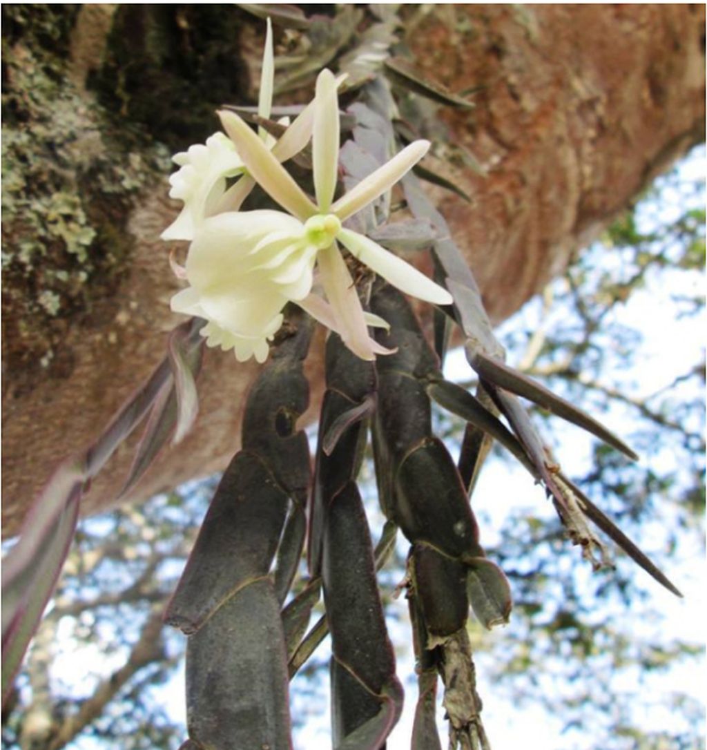 Found in Oxapampa province in central Peru on tall trunks and branches of Cedrela odorata L. trees, up to 20 meters off the ground in well ventilated, wet montane forest, as well as from large boulders, usually with bright light at elevations of 1750 to 1950 meters as a large to giant sized, cool growing pendent epiphyte or lithophyte with branching, strongly laterally compressed, ancipitose, primary stem 40" x .92" [100 x 2.3 cm], secondary stem ca. 8" x .72" [20 x 1.8 cm], produced from a sub-apical internode of the previous stem and carrying numerous on the primary stem, ca. 9 on the secondary stem; distributed throughout the stems, distichous, glaucous green, margins slightly tinged lilac, facing downwards, reclining; leaf sheaths, tubular, ancipitose, somewhat infundibuliform, partially imbricated; green, margins slightly tinged lilac, blade on the primary stem sub-equal in size, except for the basal and apical ones which are smaller, progressively larger on the secondary stem, coriaceous, narrowly lanceolate, sulcate, apex conduplicate, margin entire, spreading leaves that blooms in the summer, fall and winter on a terminal, without a spathe, .2 to .8" [0.5-2 cm] long, pluri-racemose, a short to intermediate rachis, apparently sometimes producing and additional rachis with time, sub-corymbose, 3 to 5 flowered inflorescence produced from within up to 6 diminishing sheaths, the lower ones with much reduced leaves, and with very short, triangular, acute, much shorter than the ovary floral bracts and carrying white flowers with the sepals faintly tinged pink, petals greenish white, lip pure white and column green, clinandrium-hood white; fragrance not registered.