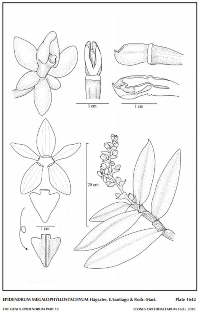 "Epidendrum megalophyllostachyum belongs to the GROUP Macrostachyum , which is characterized by the monopodial plants with sub-apical branching, rugose leaf sheaths, large leaves generally spreading, racemose, erect inflorescence, and fleshy flowers generally green to black (ripe olive colored), as well as yellow to pink to purple, with an entire, conduplicate, generally ecallose and pubescent lip embracing the column, and the nectary pubescent to papillose in front of the stigmatic cavity and at least at the base of the lip. The species is recognized by the plants to 80" [2 meters] tall, robust stems .6" [1.5 cm] in diameter, large, elliptic leaves, 4 to 43.7" x 1.2 to 2" [10 to 18 x 3 to 5 cm], apex acute, inflorescence 5.2 to 7.2" [14 to 18 cm] long, lax-flowered, bracts triangular ovate, spaced along the rachis, longer than the ovary, .4 to 1" x .4 to .8" [10 to 25 x 10 to 20 mm], sepals .72 to .8" x .36 to .48" [18 to 20 x 9 to 12 mm], flowers pale green to green-yellow. Epidendrum xylostachyum has smaller oblong-elliptic leaves, 2.4 to 5.2" x .8 to 1.2" [6 to 13 x 2 to 3 cm], apex rounded, inflorescence dense, compact, to 2.8" [7 cm] long, floral bracts nearly imbricated, .4 to .6" x .4 to .48" [10 to 15 x 10 to 18 mm], sepals .52 x .32" [14 x 8 mm]. Epidendrum munchiquense Hágsater, E.Santiago & García-Revelo has smaller plants, to 40" [1 meter] tall, leaves narrowly elliptic, apex acute to sub-acute, inflorescence 10 to 16" [25 to 40 cm] long, lax-flowered, floral bracts spaced, triangular, .24 to .52" x .16 to .32" [6 to 13 x 4 to 8 mm], sepals .56 to .72" x .2 to .32" [14 to 18 x 5 to 8 mm] long, flowers scarlet red. Epidendrum chondrochilum Schltr. has similar sized plants, but leaves are lanceolate-elliptic, 4.8 to 5.2" x 1.2" [12 to 13 x 3 cm] (on the primary stem), inflorescence 6.4 to 12" [16 to 30 cm] long, flowers black-brown, the color of ripe olives, floral bracts triangular ovate, .32 to .74" x .2 to .56" [8 to 18 x 5 to 14 mm], and sepals .44 x .2 to .24" [11 x 5 to 6 mm]." Hagsater etal 2018