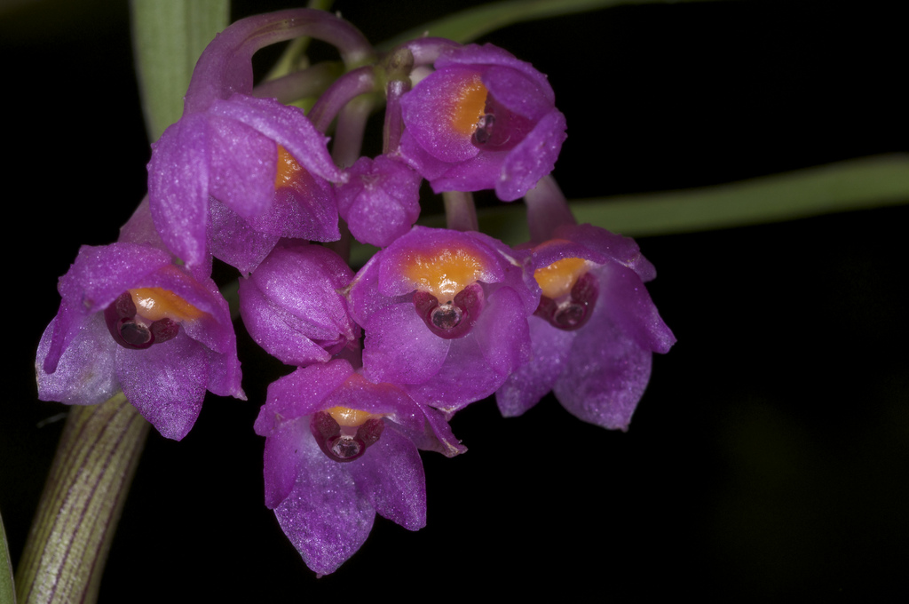 "Epidendrum melanogastropodium belongs to the GROUP Diothonea SUBGROUP Gastropodium characterized by the small, usually brightly-colored pink to purple flowers on a subsphaerical inflorescence, lip more or less cordiform, united to the basal half of the column. The new species is recognized by the deep cerise-purple flowers with a usually black column and anther, and the orange cushion, the often wide, nearly circular, rounded floral segments, the cushion is an amorphous fleshy structure, without keels on the lip. It closely resembles E. gastropodium which has acute floral segments, the lip with a fleshy amorphous cushion ending in three short keels, the column and anther are purple. Epidendrum eugenil Schltr. has acute floral segments, the lip without any thickening at the base, has 3, long, parallel keels, the column is purple. Epidendrum mesogastropodium Hagsater & Dodson has pink flowers, a burgundy red to black column, ovate-emptic, subacute sepals, the cushion of the lip reddish to orange and truncate, not ending in keels; the base of the lip is orange.." Hagsater etal 2004