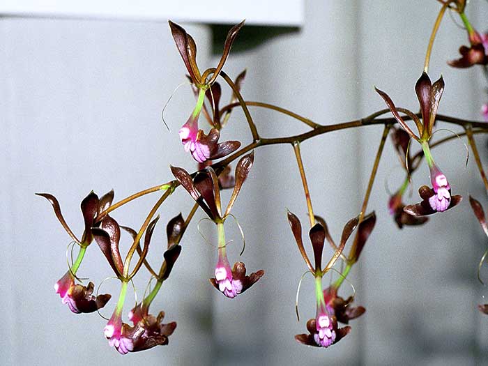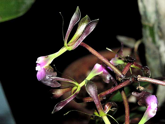 Found in Peru as a small to medium sized, cool growing, caespitose epiphyte in wet montane forests high in the canopy at elevations around 1300 meters with slender, erect stems enveloped by close, tubular, articulated, foliaceous sheaths with oblong to narrowly lanceolate, acuminate, thin, deciduous, light green, conduplicate, clasping at the base leaves that blooms in nature in the winter and early spring on a terminal, provided with 2 to 3 basal bracts, racemose or paniculate, 5" [12.5 cm] long, loosely flowered, purple inflorescence with triangular, long-acuminate floral bracts and carries a few large [in comparison to the plant], distinctly colored flowers.