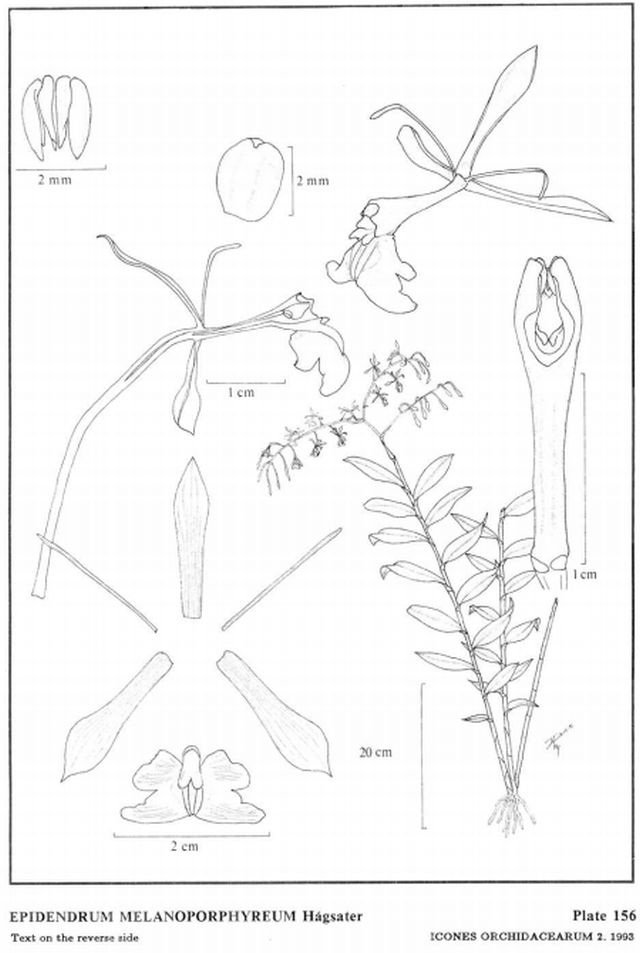 "Epidendrum melanoporphyreum looks vegetatively like most members of the GROUP Pseudepidendrum SUBGROUP Paniculatum characterized by the caespitose habit with cane-like stems carrying acute to acuminate leaves usually booming on an apical inflorescence and carrying flowers with filiform petals, and a usually 3 lobed lip with 3 parallel fleshy keels, with the apical lobe often bifurcate and the "bird wing" type pollina. The species can be easily distingllished by the very dark purple, nearly black flowers except for the green base of the column and the violet apex of the column and disc of the lip. The flowers are relatively large for the group, the sepals being .8" [20 mm] long, and the lip has the apical lobes widely divaricate, being wider across them than across the basal lobes. Other than clearly being a member of the SUBGROUP Paniculatum , it does not seem to be especially c1osely related to any particular species." Hagsater etal 1993