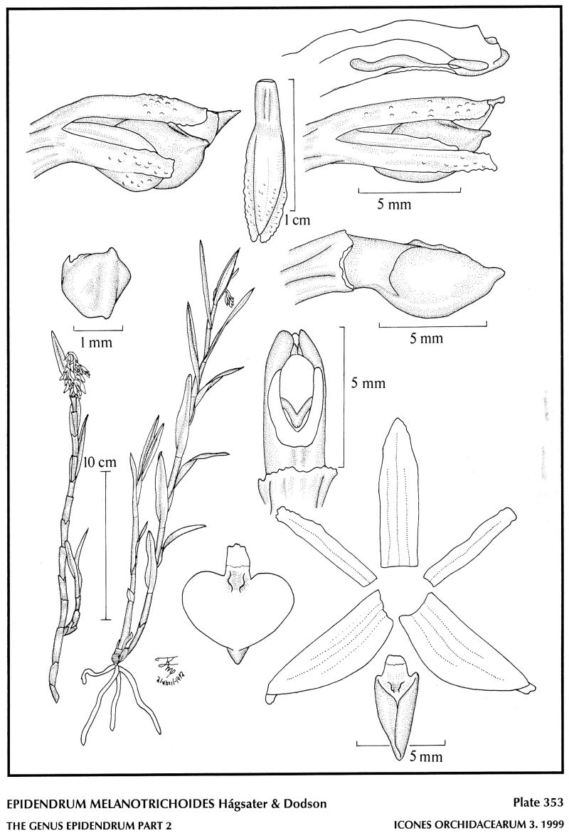 "Epidendrum melanotrichoides Hágsater & Dodson 1999 is part of the GROUP Frutex recognized by the caepitose habit, usutally simple stems, lanceolate leaves, inflorescence lacking spathes, nutant racemes, and a widely cordiform to reniform lip. This species is closely related to Epidendrum frigidum, the lip being widely cordiform. In E. frigidum the leaves are much larger, 3.2 to 3.6" [8 to 9 cm] long, the margin revolute, and the apex abruptly acute, the inflorescence longer with the bracts short and at right angles with the rachis, with pink flowers. Epidendrum frutex Rchb. f. has a rhombic lip. There has been much confusion in this group of species, and little detailed work has been done." Hagsater etal 1999