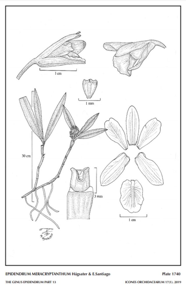 "Epidendrum meracryptanthum belongs to the GROUP Polychlamys SUBGROUP Polychlamys which is characterized by the successive lateral growths, the distichous, apical inflorescence with prominent, conduplicate, acute, glumaceous floral bracts. The species is distinguished by the short, compact inflorescence, bracts pale brown, flowers ivory white, sepals .536 to .568" [13.4 to 14.2 mm] long, petals .24" [6 mm] wide, obovoid, base cuneate, apex rounded, slightly emarginate, lip entire, sub-oblong, base deeply cordate, apex minutely emarginate. Epidendrum cryptanthum L.O.Williams also has short, compact, inflorescence, but paniculate, composed of 1 to 3 racemes (a feature which is not evident from the compact inflorescence, especially in pressed specimens), flowers creamy white totally hidden within the imbricating glumaceous bracts, sepals free, .36 to .442" [9.0 to 11.5 mm] long, petals spatulate, rounded .12 to .16" [3 to 4 mm] wide, lip obovate-pandurate with the lateral margins involute, and the thin ovary, not inflated. It has been confused with Epidendrum salpichlamys Hágsater & E.Santiago which has narrower leaves (less than .68" [17 mm] wide, a simple, sessile, compact, racemose inflorescence, imbricating floral bracts, the trumpet-shaped, greenish yellow flowers, with the sepals basally connate and abruptly reflexed above the middle, an oblong lip, and a thin non-inflated ovary. Epidendrum estrellense Ames has an elongate inflorescence 2" [5 cm] long with 7 imbricating bracts covering the peduncle, greenish yellow to green flowers of similar size, sepals .4" [10 mm] long; the lip is suborbicular-cordate, conduplicate in natural position, and the ovary does not form a vesicle." Hagsater etal 2019