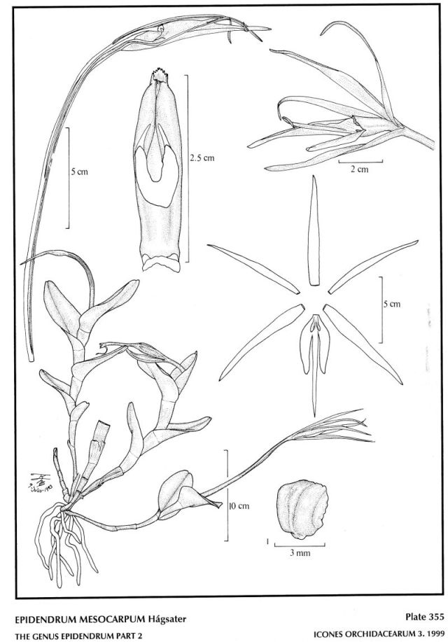 "Epidendrum mesocarpum is part of the GROUP Nocturnum characterized by the simple stems carrying large star-shaped flowers usually with a 3-lobed lip. The species is closely related to E. angustilobum and E. nocturnum Jacq., and can be recognized by the comparatively short, ancipitous stems, leaves about 2" [5 cm] wide, distributed along the apical half of the stem, the ovary longer than the leaves, 4 to 6.4" [10 to 16 cm] long, and the capsule with very long pedicel and apical neck, the former longer, the body proper only occupying about 1/3 of the length and located slightly beyond the middle of the length. Epidendrum nocturnum, the only other species found in northern Middle America, has a short ovary, shorter than the leaves, with the body of the capsule occupying nearly its entire length. E. angustilobum, found on the Antilles, as well as in Costa Rica and Panama, also has wide leaves, but these are flat and not cupped, and aggregate towards the end of the tall stems, the body of the capsule is located towards the end of the pedicel, with a very short apical neck." Hagsater etal 1999