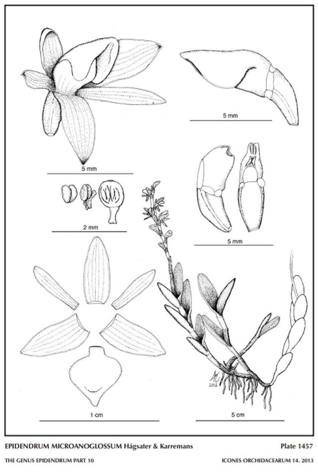 "Epidendrum microanoglossum belongs to the GROUP Neowilliamsia characterized by the ancipitose stems and rachis, the rachis with conduplicate, acute bracts, distichous, usually non-resupinate flowers, the lip often digitate and the 2 or 4 pollinia with 2 hard, laminar, caudicles. The species is recognized by its similarity with Epidendrum anoglossum but about half the size; shorter leaves .8 vs 1.6" [2 vs. 4 cm] long on average, shorter distance between flowers .2 vs .4" [5 mm vs. 10 mm], greenish flowers vs. yellowish, sepals and petals only partly spreading vs. very much spreading, even being retorse, a shorter and differently shaped petal, .18 vs .28" [4.5 mm long vs. 7 mm] long; wider near the apex vs. wider at the middle and, the shorter and differently shaped lip .18" vs .28" [4.5 mm vs. 7 mm]; ovate-rhombic vs. triangular. Epidendrum cymbiglossum Hágsater is also similar and its type specimen was collected on Cerro Pando as well; however, it is bifoliate vs. 3- to 7 leaved, has a much larger lip .68 vs .18" [17 mm vs. 4.5 mm] long, yellow vs. greenish flowers and with a long-trapezoid lip vs. ovate-rhombic." Hagsater etal 2013