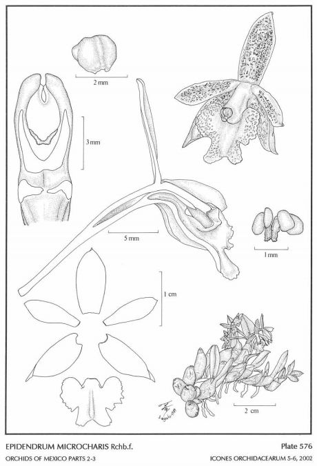 "Epidendrum microcharis is part of GROUP Kalopternix SUBGROUP Serpens characterized by the aggregate, globose pseudobulbs with fleshy-coriaceous leaves, a sessile inflorescence, and one or few fleshy, compact, star-shaped flowers, often burgundy red in color, lip entire, more or less cordiform. The species is easily recognized by the small, fusiform, finely rugose pseudobulbs, usually with two, coriaceous leaves, with a very short inflorescence bearing 2 to 4 flowers which are basically green, usually heavily dotted with burgundy red, the lip 3-lobed, with the margins deeply erose-dentate, the sepals are .28 to .48" [7 to 12 mm] long. The only somewhat similar species in Mexico is E. miserum Lind., which has thin, deciduous leaves, wrinkled ellipsoid pseudobulbs of a gray color, the flowers being smaller in size, the margins entire and the dorsal sepal just .18 to .2" [4.5 to 5 mm] long. Both species are rather unusual in that the stems are short and thickened into pseudobulbs, the flowers, however, are clearly of Epidendrum, with the slit rostellum and the lip adnate to the column." Hagsater etal 1999