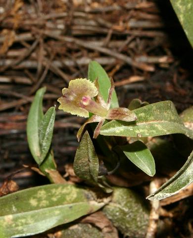 Found in Chiapas state of Mexico in evergreen cloud forests at elevations of 2300 to 3100 meters as a mini-miniature sized, cold growing epiphyte with slightly distant, fusiform to subspheric, finely rugose, often purple pseudobulbs carrying usually 2, apical, somewhat recurved, deeply purple flushed, coriaceous, elliptic-lanceolate, persistent leaves that blooms at any time of the year on a terminal, very short, racemose, 2 to 4 flowered inflorescence arising on a newly maturing pseudobulb with triangular, acuminate floral bracts partially obscured by the leaves and carrying resupinate flowers with a green fragrance.