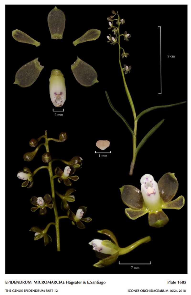"Epidendrum micromarciae belongs to the GROUP Mancum SUBGROUP Mancum which is characterized by the sympodial growth, narrow spathaceous bracts with parallel sides, erect raceme with non-resupinate flowers and a generally reduced, fleshy lip. The new species can be recognized by overall smaller size compared to E. marciae, a single spathe, inflorescence lax, fewer flowered, petals .2 to .22 x .08" [5.0 to 5.5 x 2.0 mm], narrowly oblong-obovate, obtuse, and the entire lip, .6 x .8" [1.5 x 2.0 mm], with a mid-rib in between the calli and slightly surpassing them. E. marciae is very similar, but somewhat larger overall, also has 2 to 4 leaved stems, leaves 1.4 to 3.2" x .28 to .56" [3.5 to 8.0 x 0.7 to 1.4 cm], the inflorescence subtended by 1 to 2 spathes, flowers dark brown with column and lip white with purple dots on apex of column and calli, petals .22 to .24" x .132 to .16" [5.5 to 6.0 x 3.3 to 4.0 mm], obovate-spatulate, apex rounded, and lip .152 x .232" [3.8 x 5.8 mm], united to the column, reniform, base cordate, with a pair of apical incisions, thus slightly 3-lobed, apex rounded, concave in natural position; bicallose, the calli fleshy, prominent, parallel, extending to the middle of the disc or more. Epidendrum punense Hágsater & Dodson has a solitary leaf 4.4 to 5.2" x .8 to .88" [11 to 13 x 2.0 to 2.2 cm], single, ancipitose spathe covering the whole peduncle, obovate petals .321 to .32" x .14 to .148" [7.8 to 8.0 x 3.5 to 3.7 mm], with the margin undulate and laminar, and entire, reniform lip .192 to .2" x .26 to .292" [4.8 to 5.0 x 6.5 to 6.8 mm], with a pair of incisions at the apex. Epidendrum montisillinicense Hágsater et Dodson, from the same general area is vegetatively similar, flowers also similarly colored, petals .208 to .22" x .08 to .092" [5.2 to 5.5 x 2.0 to 2.3 mm], spatulate, apex obtuse, but lip .16 to .168" x .172 to .2" [4.0 to 4.2 x 4.3 to 5.0 mm], is deeply 3-lobed, lateral lobes sub-quadrate, apical margin dentate; mid-lobe sub-quadrate, apiculate. Epidendrum mancum Lindl., has 2 to 3 wider leaves .8 to 2.4" x .52 to 1.08" [2 to 6 x 1.3 to 2.7 cm], the inflorescence subtended by single spathe, flowers red-brown, column and lip white, petals .2 to .24" x .12 to .16" [5.0 to 6.0 x 3.0 to 4.0 mm], asymmetrically spatulate, obtuse, marginally entire to sinuate, and a reduced, entire, sub-quadrate lip .192 to .2" x .096 to .14" [4.8 to 5.0 x 2.4 to 3.5 mm]." Hagsater etal 2018