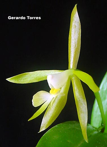 Found in Venezuela, Colombia, Ecuador, Peru, Brazil and Guyana at elevations around 300 to 900 meters as a miniature sized, hot to warm growing epiphyte or lithophyte with simple, cane-like, laterally compressed towards the apex, terete at the base stems carrying 2 to 6, distributed along the apical half of the stem, coriaceous, narrowly elliptic to lanceolate, obtuse, slightly carinate, mucronate, basally clasping leaves that blooms at any time of the year on a terminal, racemose, becoming pluriracemose over the years, successively single, several flowered inflorescence with much shorter than the ovary, amplexicaul, triangular, acute to acuminate floral bracts.