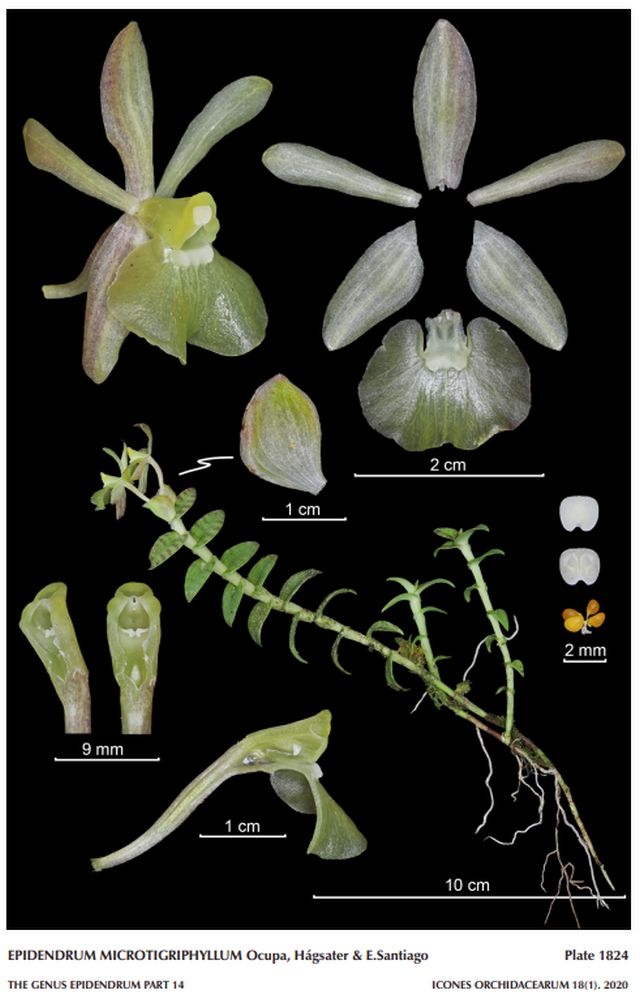 "Epidendrum microtigriphyllum belongs to GROUP Megalospathum SUBGROUP Tigriphyllum characterized by the caespitose but branching habit, the many-leaved stem, fleshy, oblique leaves, a short, few flowered, raceme subtended by large semi-ovate spathaceous bracts, resupinate flowers, and the column more or less united to the lip, and the GROUP Megalospathum SUBGROUP Tigriphyllum which is characterized by the plants generally pendant and the leaves ovate to lanceolate, with purple-reddish transversal lines. The new species is recognized by the comparatively small leaves, .4 to 1.2" x .16 to .4" [1.0 to 3.0 x 0.4 to 1.0 cm], the column straight with fleshy prominent clinandrium-hood, and the lip cordiform-reniform, widest beyond the middle, and callus prominent, entire, broad, white, the sides formed by semi-orbicular thickenings. Epidendrum tigriphyllum Hágsater has pendulous plants, larger leaves, .64 to 1.52" x .02 to .06" [1.6 to 3.8 x 0.5 to 1.5 mm], narrower petals .84" x .064 to .08" [21 x 1.6 to 2.0 mm], the column a very prominent, fleshy with an expanded clinandrium-hood, and the lip spade-shaped, with only a slightly cordate base, obtuse apex, with a narrow, prominent callus divided into 4 lobes, one pair superimposed on the other pair. Epidendrum miradoranum Dodson & D.E.Benn. has ovate-lanceolate leaves .48 to 1.08" x .2 to .4" [1.2 to 2.7 x 0.5 to 1.0 cm], a single apical spathe .64" [16 mm] long, and up to 4 green flowers slightly tinged pale pink, sepals .88 to 1" [22 to 25 mm long, and the lip rectangular-reniform with two short, sub-orbicular calli. Epidendrum chaparense Dodson & R.Vásquez has narrowly lanceolate, oblique leaves, .56 to 1" x .12 to .32" [1.4 to 2.5 x 0.3 to 0.8 cm], a two-flowered inflorescence, flowers smaller, pale greenish white, sepals .52 to .56" [13 to 14 mm] long, and the lip sub-orbicular with a pair of short, globose calli" Hagsater etal 2020