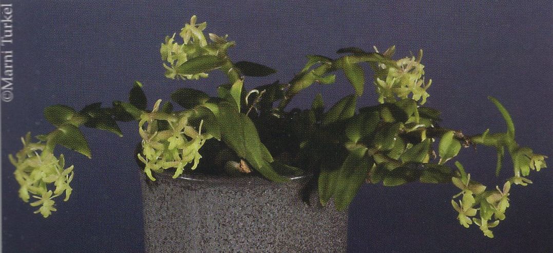 Found in Ecuador, Peru and Bolivia in montane cloud forests at elevations around 1800 meters as a miniature to just small sized, cool growing, pendulous epiphyte with canelike, flattened, branching stems enveloped completely by evanescent, imbricating, uppermost leaf bearing sheaths and carrying narrowly ovate, acute, asymetrical and dentate apically leaves that blooms in the summer on a terminal, fasciculate, racemose, short, successively several flowered inflorescence with triangular floral bracts.