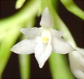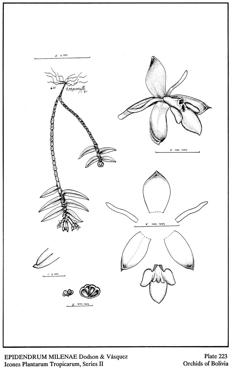 "Epidendrum millenae belongs to the GROUP Nanum characterized by the dichaea-like pendant stems with pairs of apposing flowers on an inflorescence without spathaceous bracts and has prominent floral bracts. The species is closely related to Epidendrum bonitense Dodson & Hágsater, from which has larger flowers with the sepals being .48" [12 mm] long, the subrectangular, acute, twice as long as wide lip, and the somewhat different coloring of the anther. Epidendrum bonitense was found sympatric with the similar E. thelephorum Hágsater & Dodson, which is smaller, with the midlobe of the lip ovate, rounded, and the anther prominently papillose. This group of species has been little studied, and further work in the field will certainly produce other undescribed species. The vegetative habit is that of a caespitose plant which also produces new stems from near the apex of the previous stem, a feature typical of this group of species." adapted from E bonitense Icones 2 Plate 113 Hagsater etal 1993
