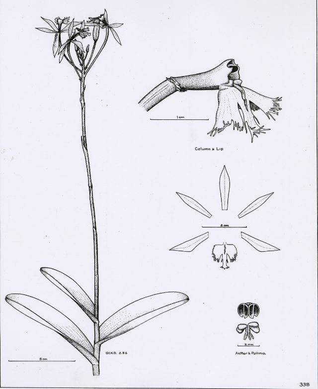 Found in Venezuela as a hot to warm growing terrestrial with cane like, erect stems carrying oblong, basally clasping leaves that blooms on a a terminal, erect, without a spathe, peduncle 8" [20 cm] long, rachis 2" [5 cm] long, provided with 5 bracts, successively few, several flowered inflorescence carrying variously colored flowers, all held in one plane, but the lip facing inwards, with narrower petals and midlobe of the lip than E mimopsis