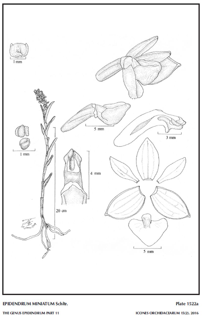 "Epidendrum miniatum is part of the GROUP Pachychilum characterized by the monopodial plants with sub-apical branching, rugose leaf sheaths, by the relatively small leaves, parallel to the stem, the short, racemose, erect inflorescence, brightly colored flowers, yellow to orange to reddish pink, with an entire, conduplicate, lip embracing the column, without any pubescence in front of the stigmatic cavity nor on the lip, but generally with two small calli. The species is recognized by the smaller plants, up to 48" [120 cm] tall, leaves lanceolate, .6 to 2.4" x .2 to .36" [1.5 to 6 x 0.5 to 0.9 cm], parallel to the stem and partly imbricating; inflorescence dense, with 10 to 15, reddish-pink flowers, including the ovary, sepals .248 to .3" x .14 to .18" [6.2 to 7.5 x 3.5 to 4.5 mm]; apex of column blunt, without teeth. Epidendrum pachychilum Kraenzl. is vegetatively very similar, but the inflorescence few-flowered, with up to 8, sulfur-yellow to green flowers, sepals ca. .44" [11 mm] long, and the lip widely triangular when spread, column with an uncinate tooth each side at the apex. Epidendrum incapachychilum Hágsater & E.Santiago has taller plants, to 60" [1.5 meters] tall, leaves .96 to 2.2" [2.4 to 5.5 cm] long, inflorescence generally lax, with 7 to 9 [12] flowers colored reddish orange to yellowish orange with the ovary green, sepals .32 to .374" x .168 to .204" [8 to 9.4 x 4.2 to 5.1 mm], and the lip widely hemi-orbicular to widely triangular when spread, with a wide apicule, apex of the column with a pair of long straight teeth." Hagsater etal 2016