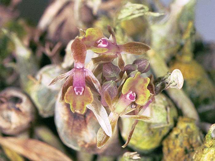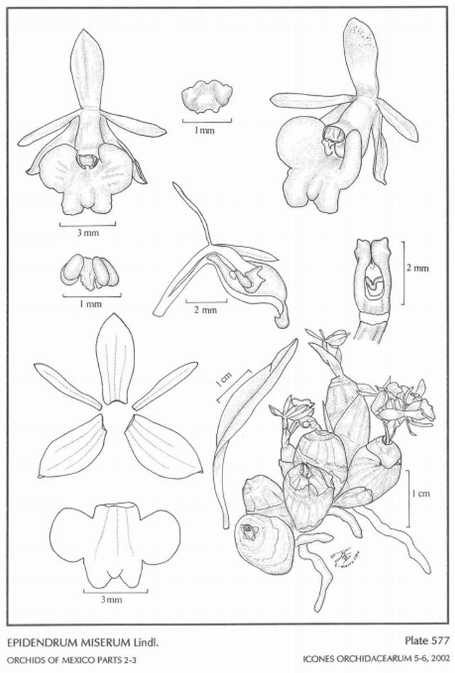 "Epidendrum miserum is part of GROUP Kalopternix SUBGROUP Serpens characterized by the reduced rhizomatous, aggregate pseudobulbous stems with one or few fleshy-coriaceous leaves, and an apical, sessile inflorescence without spathacecous bracts, carrying compact, star-shaped flowers, often burgundy red in color, lip entire, more or less cordiform. The species has numerous small, aggregate pseudobulbs, leafless when in flower; the flower is somewhat similar to that of E. galeottianum (the Mexican species of the GROUP Anceps, and was indeed compared by Lindley with E. musciferum, the Colombian species of the group); greenish dotted with burgundy red, fleshy, with the apicallobes rounded and the margins entire. In the wild the plants are usually discovered when climbing a shrubby oak for something else, and realizing that there is something bulky under your hand, thicker than the rest of the oak branch. During the early rainy season the plants are easier to distinguish due to the fresh, grayish-green leaves. The only other small species of the genus with pseudobulbs in Mexico is E. microcharis Rchb f which has non-deciduous, coriaceous leaves and an erose-dentate lip; E. microcharis dwells in wet, high-altitude evergreen cloud forest." Hagsater etal 2002