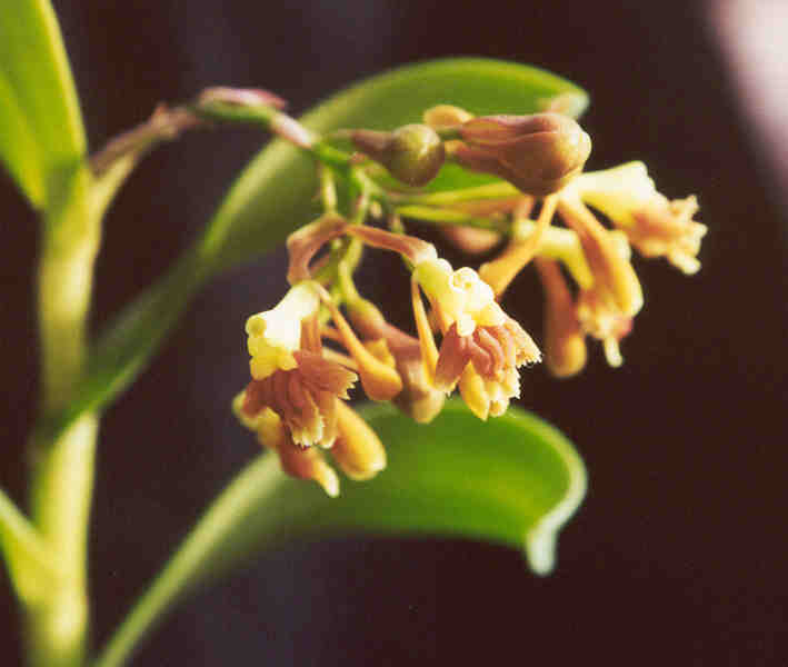 Found in Oaxaca state of Mexico in mixed humid forests at elevations of 1200 to 1800 meters as a small to large sized, cool growing epiphyte with simple, terete, cane-like stems enveloped by thin, scarious older leafless and leaf-bearing sheaths and carrying 2 to 12, towards the apex, narrowly elliptic-lanceolate, acute, basally clasping and articulate to the leaf bearing sheaths that blooms in the fall, winter and early spring on a terminal, occurs over several years from the same peduncle, arcuate, with one to several racemes, 1.6 to 4.8" [4 to 12 cm] long, dense, simultaneously 10 to 25 flowered inflorescence with 2 to 5, basal, imbricating, oblong-triangular, tubular, larger than the much shorter than the ovary, free, triangular, attenuate floral bracts and carrying resupinate, fleshy flowers.
