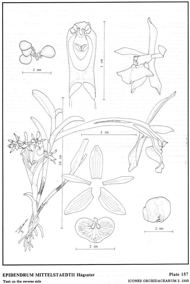 "Epidendrum mittelstaedtii is a member of the GROUP Difforme characterized by the caespitose, sympodial plants, fleshy, pale green to glaucous leaves, apical inflorescence, sessile, rarely with a short peduncle, one-flowered to many-flowered, and then corymbose, without spathaceous bracts, fleshy, green to yellowish-green rarely white flowers. The species can be recognized by the somewhat laterally compressed stems, markedly ascending leaves, 4 to 5 simultaneous, bright green flowers, broadly cordiform lip and clinandrium not prominent with margin crenate. The species most similar is Epidendrum succulentum Hágsater, which has bigger plants, leaves not ascending, 5 to 10 fragrant, green to yellowish-green flowers and prominent, fimbriate clinandrium. Epidendrum erectifolium Hágsater & L. Sánchez is also similar, but is distinguished by the slightly flexuous, terete stems, 4 to 17 flowers, 3-lobed lip with the midlobe bilobed, and a prominent, erose clinandrium." Hagsater etal 1993