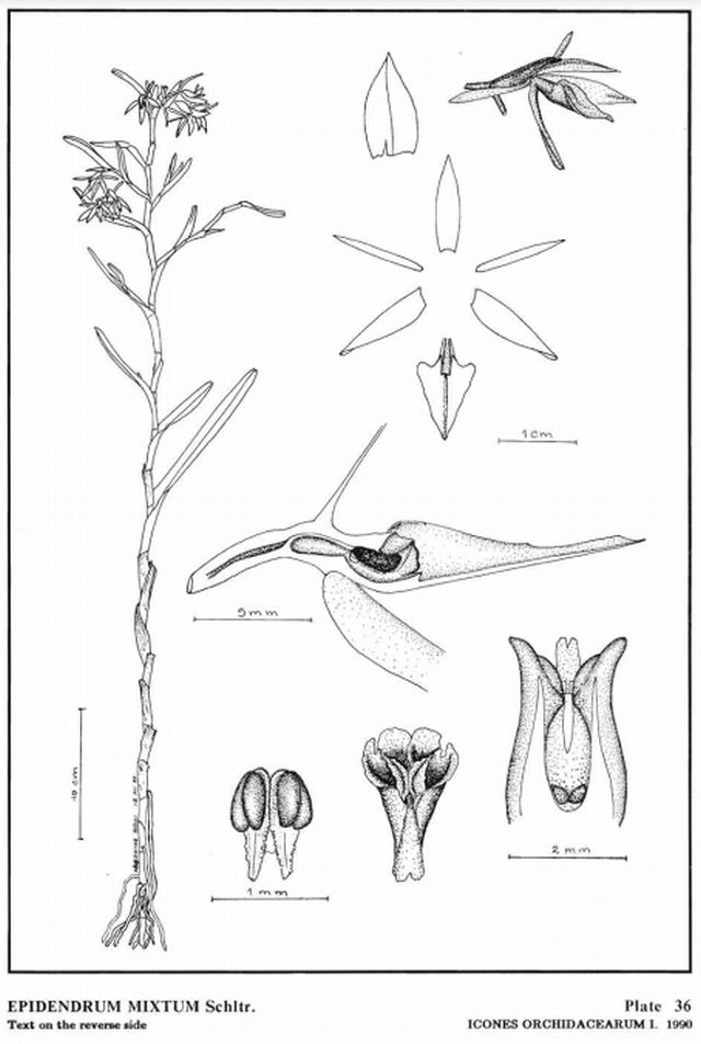 References W3 Tropicos, Kew Monocot list , IPNI ; The Genus Epidendrum Ames 1936 as E ramosum var mixtum; Ceiba Vol 5 No 1 L O Williams 1956 as E ramosum var mixtum; Las Orquideas de El Salvador Vol 1 Hamer 1974 drawing/photo fide; Die Orchideen 3 Auflage Bd 1 Sonderabdruck aus Schlechter Lieferung 9 513 - 576 Brieger, Maatsch and Senghas 1977; Las Orquedias de El Salvador Vol 3 Hamer 1981 drawing hmm; Icones Planetarum Tropicarum Plate 722 Hamer 1982 drawing ok; Selbyana Vol 10 Orchids of Central America Hamer 1988 drawing fide; Icones Orchidacearum 1 Plate 036 Hagsater & Salazar 1990 drawing fide; Icones Orchidacearum 2 Plate 122 Hagsater & Sanchez 1993 see recognition section; Icones Orchidacearum 2 Plate 159 Hagsater & Salazar 1993 see recognition section; Icones Orchidacearum 5&6 Plate 581 Hagsater & Salazar 2002 see recognition section; Orchids of Mexico Hagsater, Soto, Salazar, Jimenez, Lopez and Dressler 2005; Icones Orchidacearum 9 Plate 942 Hagsater & Salazar 2007 see recognition section; Guia de Orquideas de Chiapas Carlos Rommel Beutelspacher Baigts 2013 photo fide; Algunas Orquideas de Mexico Tomo 1 Suarez 2013 photo fide; Orchid Genera and Species in Guatemala Archila, Szlachchetko, Chiron, Lipinska, Mystkowska and Bertolini 2018