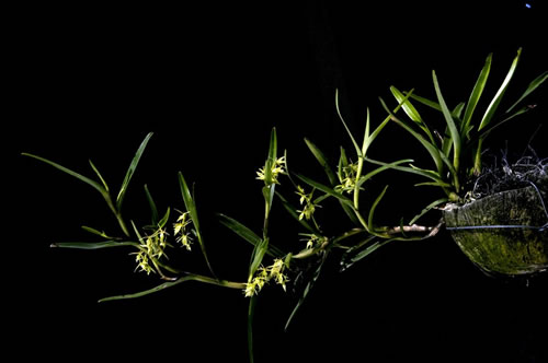 Found in Mexico, Guatemala, El Salvador, Honduras and Nicaragua in wet montane forests at elevations of 400 to 2400 meters as a medium to giant sized, warm to cold growing epiphyte or lithophyte on sheer rock cliffs with a straight to zigzag main stem carrying lanceolate-ligulate leaves and secondary and tertiary stems carrying smaller ones that blooms in the fall and winter on a terminal, arising on the secondary and tertiary stems, arcuate, zigzag, simultaneously 4 to 8 flowered inflorescence with conduplicate, prominent, from longer to twice as long as the ovary, ovate, acute floral bracts carrying resupinate, fragrant flowers.