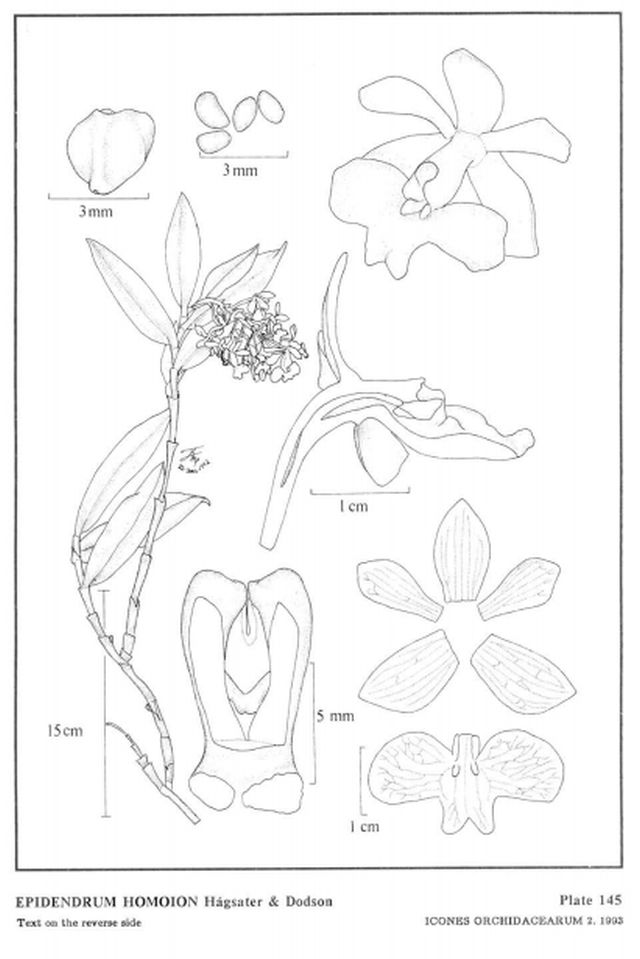 "Epidendrum homoion is part of GROUP Arbuscula SUBGROUP Incomptum which is characterized by the erect habit with successive lateral growths produced from the middle of the previous growth, few leaves aggregate towards the apex of the stems, roots produced generally only from the base of the primordial stem, inflorescences are short with fleshy yellowish to green to violet-green to black flowers with short ovaries, the lip entire to 3-lobed. The species is superficially similar to E. incomptum Rchb. f. , E. evelynae Rchb. f., E.lechleri Rchb. f., E. morganii Dodson & Garay, and E. yambalense Hágsater & Dodson. The plants are not very strong, the leaves being thin and the veining clearly visible. The lip with large semiorbicular lateral lobes and subquadrate midlobe is similar to E. incomptum, which has the midlobe acute, not emarginate. Epidendrum yambalense has acute segments, narrower lateral lobes and apiculate midlobe. Epidendrum homoion is also similar to E. curtisii A.D. Hawkes, E. superpositum Garay and E. tamaense Foldats, all of which have an emarginate midlobe, but these species can all be distinguished by the differently proportioned floral parts." Hagsater etal