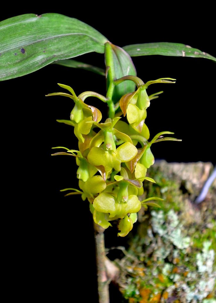 Found in Napo province of Ecuador on trees in rolling pastures at elevations around 1800 meters as a large sized, cool growing epiphyte with simple, cane-like, straight, arising from the middle internode of the previous stem carrying 3 to 6, all towards the apex, elliptic, membraneous, clearly visible veined leaves that blooms in the late spring on a terminal, arising on a mature stem, occuring only once, arcuate, racemose, simultaneously 1 to 19 flowered inflorescence with much shorter than the ovary, triangular, acute floral bracts and carrying resupinate flowers with the tepals green and the lip olive green to purplish green.