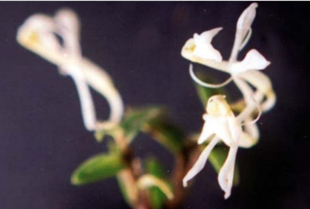 Found in Pasco department of Peru on the upper slopes of the Cordillera Oriental of the Andes at elevations of 2900 to 3000 meters as a small sized, cold growing epiphyte with cane-like, branching, main stem much longer than the branches, subterete, slightly sinuous stems carrying many on the main stem, 2 to 3 on each branch, suberect, articulate, coriaceous, linear-lanceolate, obtuse, minute apical apicule, apical margin crenate leaves that blooms in the spring and summer on a terminal, racemose, peduncle to .12” [3 mm] long, arching-nutant, .28” [7 mm] long overall, lax, simultaneously 7 flowered inflorescence with half as long as the ovary, linear-triangular, acuminate floral bracts and carrying resupinate, glabrous, cream colored flowers sometimes with red spots.