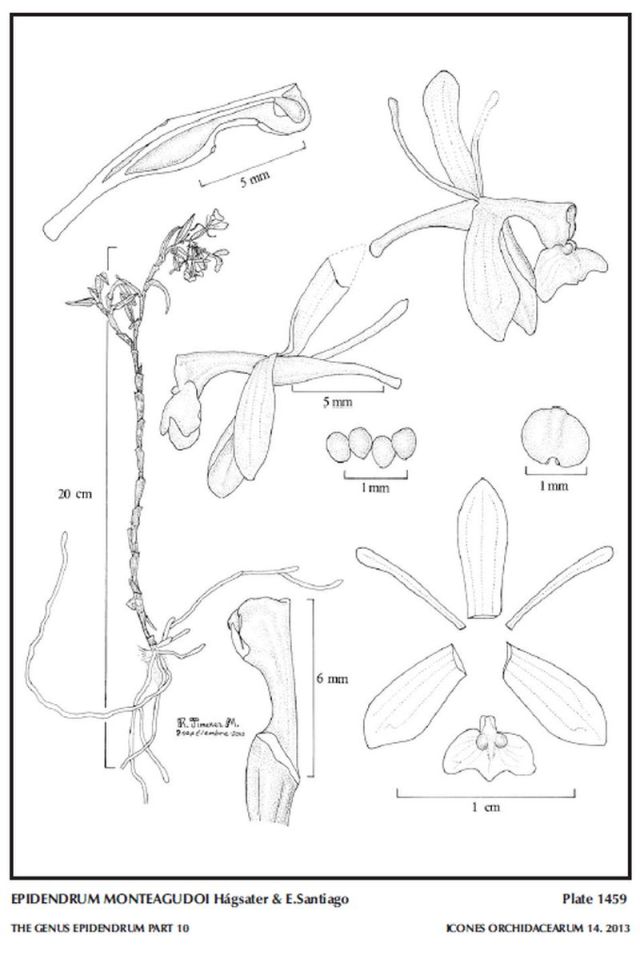 "Epidendrum monteagudoi belongs to GROUP Andean SUBGROUP Soratae which is characterized by the branching habit starting on a primary stem, infundibuliform, rugose leaf-sheaths, lanceolate, aristate, acute leaves, racemose subcapitate inflorescence on a short, thin peduncle, and the bicallose lip. The species is recognized by the cream-colored flowers sometimes with wine-red spots, the minute lip clearly 3-lobed with the margin entire, and the midlobe widely triangular. Epidendrum soratae has immaculate, greenish yellow flowers, the lip slightly 3-lobed, deeply cordate at the base, and bilobed at the apex. Epidendrum physopus Kraenzlin, has greenish-yellow flowers somewhat tinged with purple, but the lip is deeply 3-lobed, with an erose margin, and the ovary is not inflated." Hagsater etal 2013
