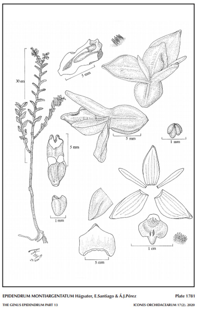 "Epidendrum montiargentatum belongs to the GROUP Aquaticum which is characterized by the monopodial, branching habit, the distichous and erect arching-nutant inflorescence, fleshy flowers, and the disc of the lip and/or nectary often pilose. The new species is recognized by the red flowers, leaves .54 to .92" x ,28 to .48" [1.3 to 2.3 x 0.7 to 1.2 cm], ovate, floral bracts widely triangular and slightly retrorse, the lip 3- lobed with lateral lobes transversely rectangular, the corners rounded, and the single callus “U” shaped and pubescent. Epidendrum stenocalymmum is vegetatively similar but the flowers are yellow or greenish cream colored, lip entire, cuneate and apiculate, bicallose. Epidendrum neillii Hágsater & E.Santiago has oblong-elliptic leaves, greenish yellow flowers with the lip lime green, floral bracts not retrorse, and a lip entire, widely mucronate, bicallose. Epidendrum campylorhachis Hágsater & Dodson has narrowly elliptic leaves, flowers greenish yellow, floral bracts retrorse and a rachis markedly flexuous, the lip 3-lobed with the lateral lobes obovoid, and the callus is “V” shaped." Hagsater etal 2020