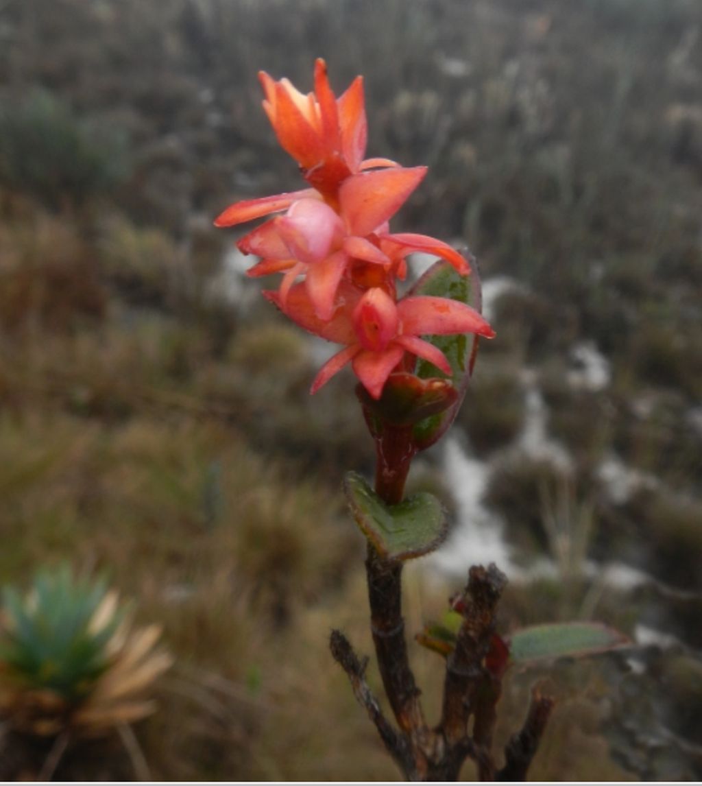 Found in Zamora Chinchipe province of Ecuador on the highest point of the Cordillera del Cóndor on an Andean tepui of sandstone among herbaceous “paramuna” vegetation and low, dense brush dominated by terrestrial bromeliads and grasses growing directly on sandstone and sandy acid soil at an elevation around 2850 meters as a medium sized, cold growing lithophyte with the primary stem 1.76 x .16 to .2" [44 x 0.4 to 0.5 cm], branches 4 to 4.8 x .16 to .2" [10 to 12 x 0.4 to 0.5 cm], cane like, erect, terete, thin, the base covered by sheaths .24 to .72" [6 to 18 mm] long, tubular, non-foliar sheaths and carrying 15 on the primary stem, distributed along the apical half of the stem, 9 to 12 on the branches, distributed throughout, alternate, sub-spreading, coriaceous, provided with tubular, minutely striated sheaths; blade all similar in size and shape, ovate, apex obtuse, minutely apiculate, margin entire, slightly revolute leaves that blooms in the winter on a terminal, erect, without a spathe, peduncle very short, rachis sessile, slightly flexuous, 1.28 to 1.92" [3.2 to 4.8 cm] long including the flowers, apical, racemose to sometimes 2-branched, erect, laxly successivley few to 19 flowered inflorescence with longer than the ovary, widely triangular, acuminate, embracing, slightly retrorse floral bracts and carrying non-resupinate, red flowers with fragrance not registered.